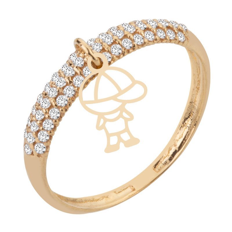 Anel aparador com menino em ouro 18k e 3 fileiras de zircônias.