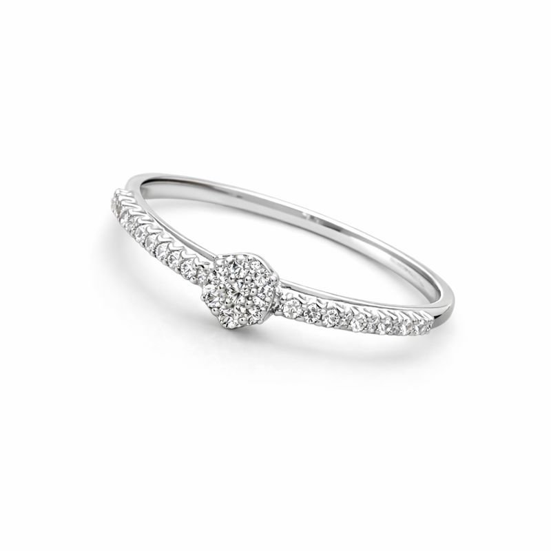 Anel chuveiro flor com pedras laterais em ouro branco 18k com zircônias.