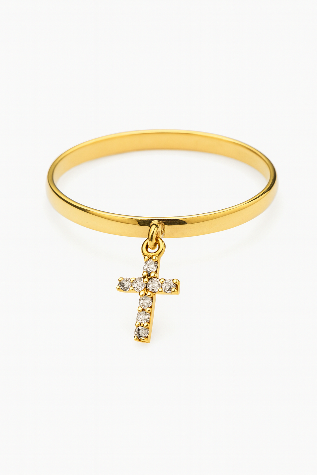 Anel cruz pendurada em ouro 18k com zircônias.