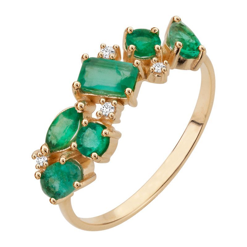 Anel em ouro 18k com 6 esmeraldas e 4 brilhantes de 1pt.