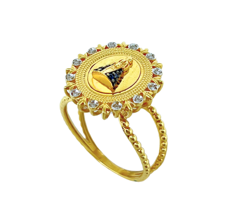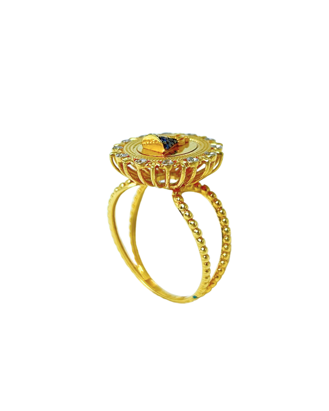 Anel Nossa Senhora Aparecida em ouro 18k com 24 brilhantes e 6 safiras.