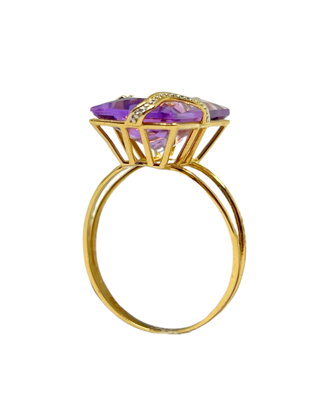 Anel e ouro 18k com pedra retangular Ametista e detalhe em ouro branco.