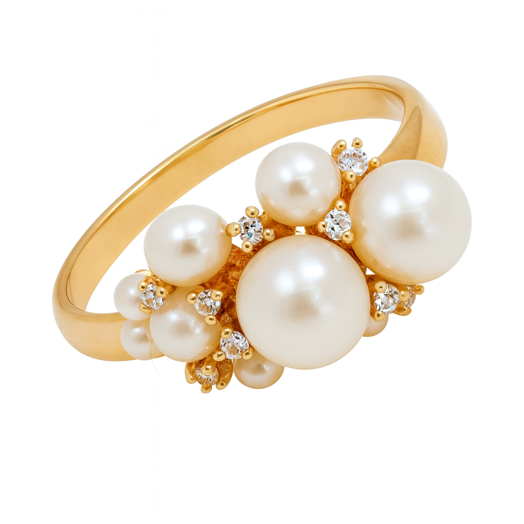 Anel em ouro 18k com 9 pérolas e 9 safiras brancas.