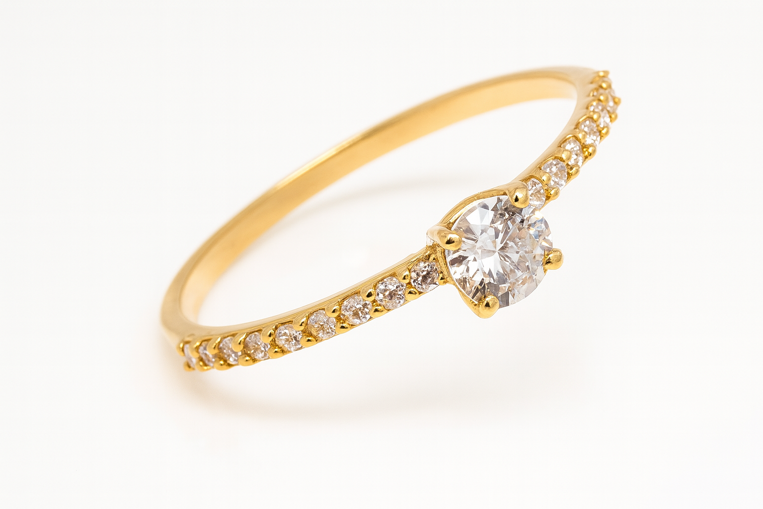 Anel solitário com pedras laterais em ouro 18k com zircônia.
