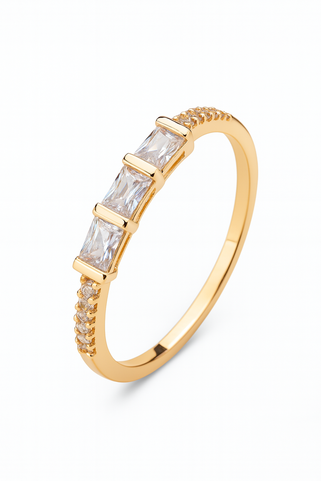 Anel em ouro 18k com três pedras retangulares e pedras laterais em zircônia.