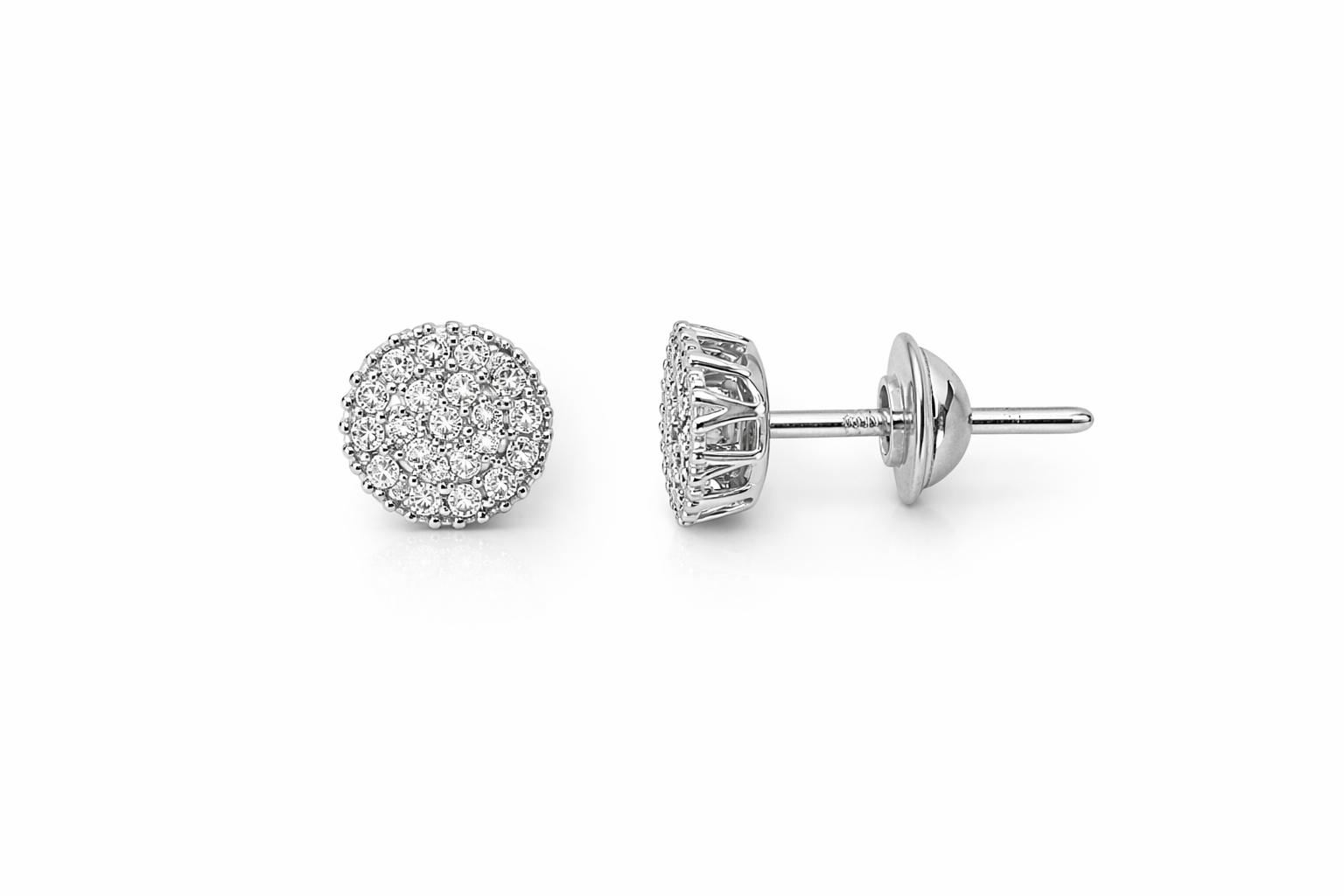 Brinco chuveiro redondo em ouro branco com zircônias.