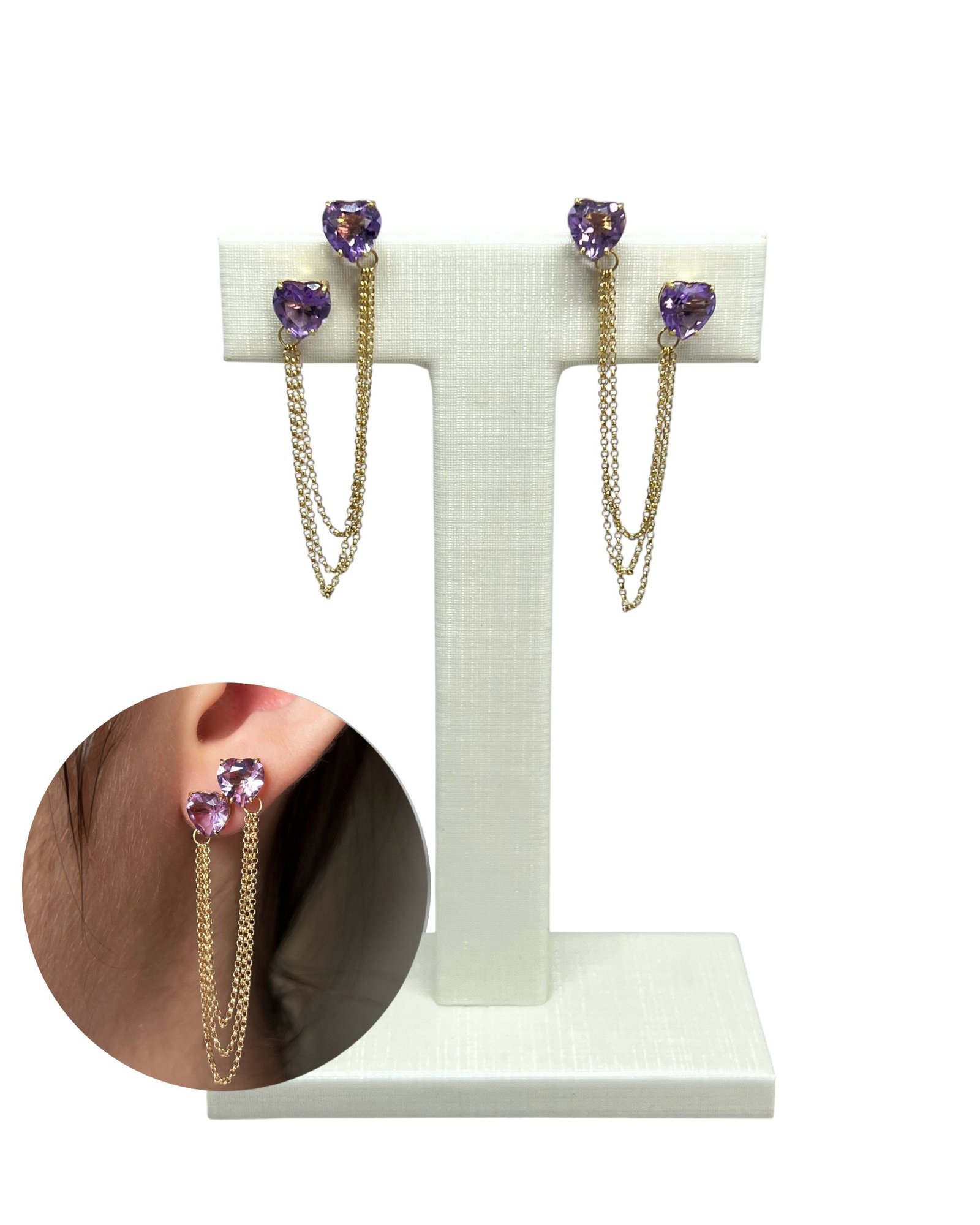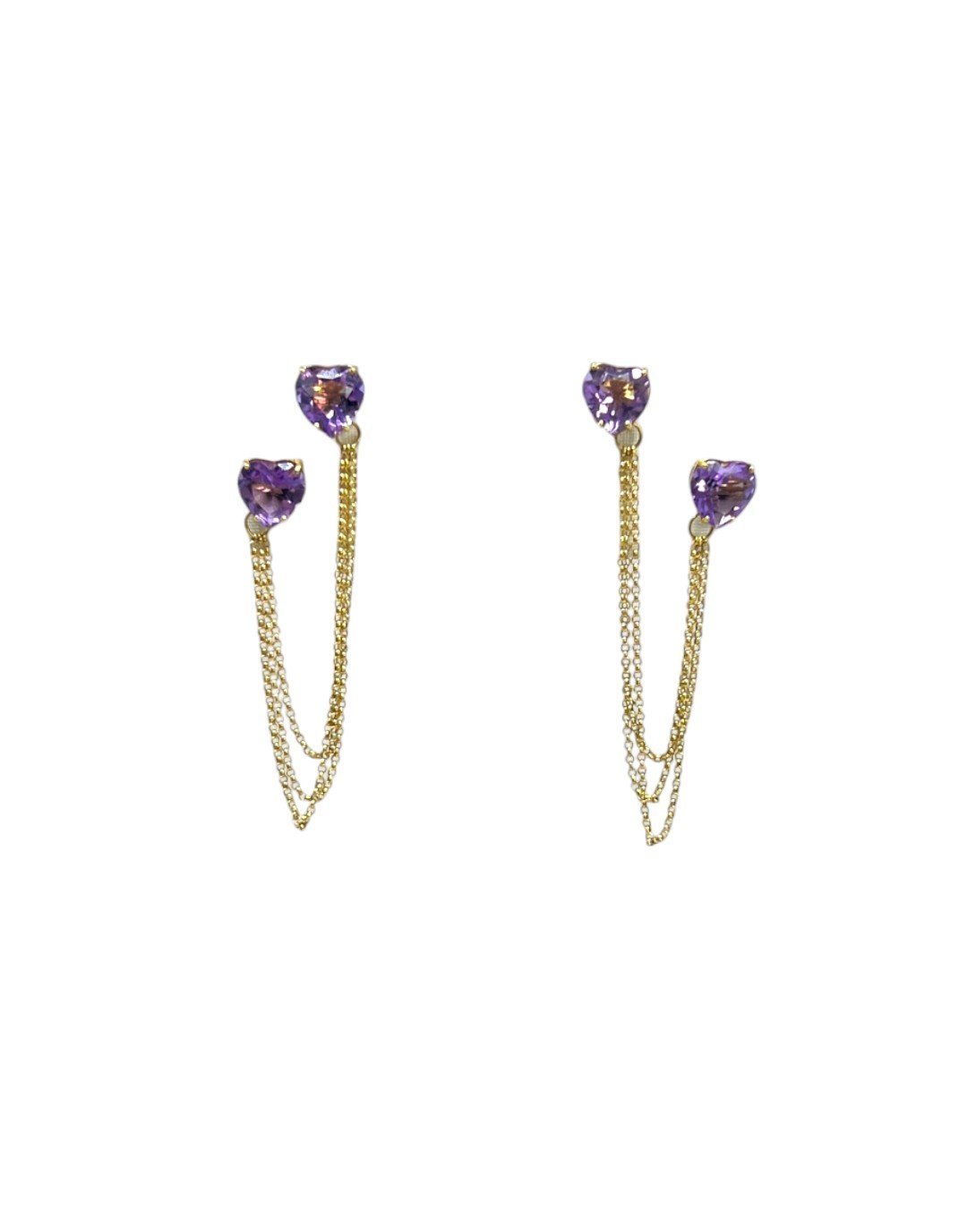 Brinco com corações de pedra natural ametista com correntes de elo português em ouro 18k.