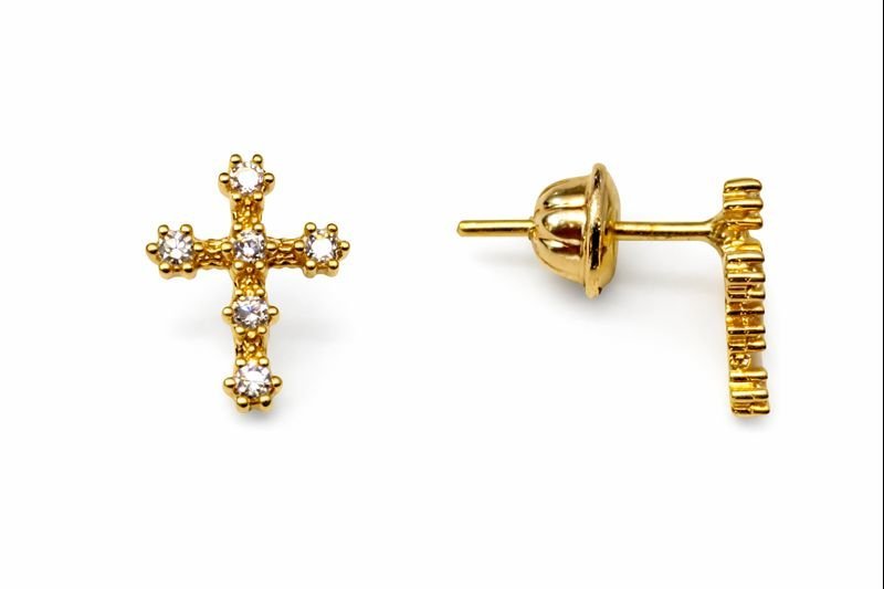Brinco cruz em ouro 18k com zircônias.