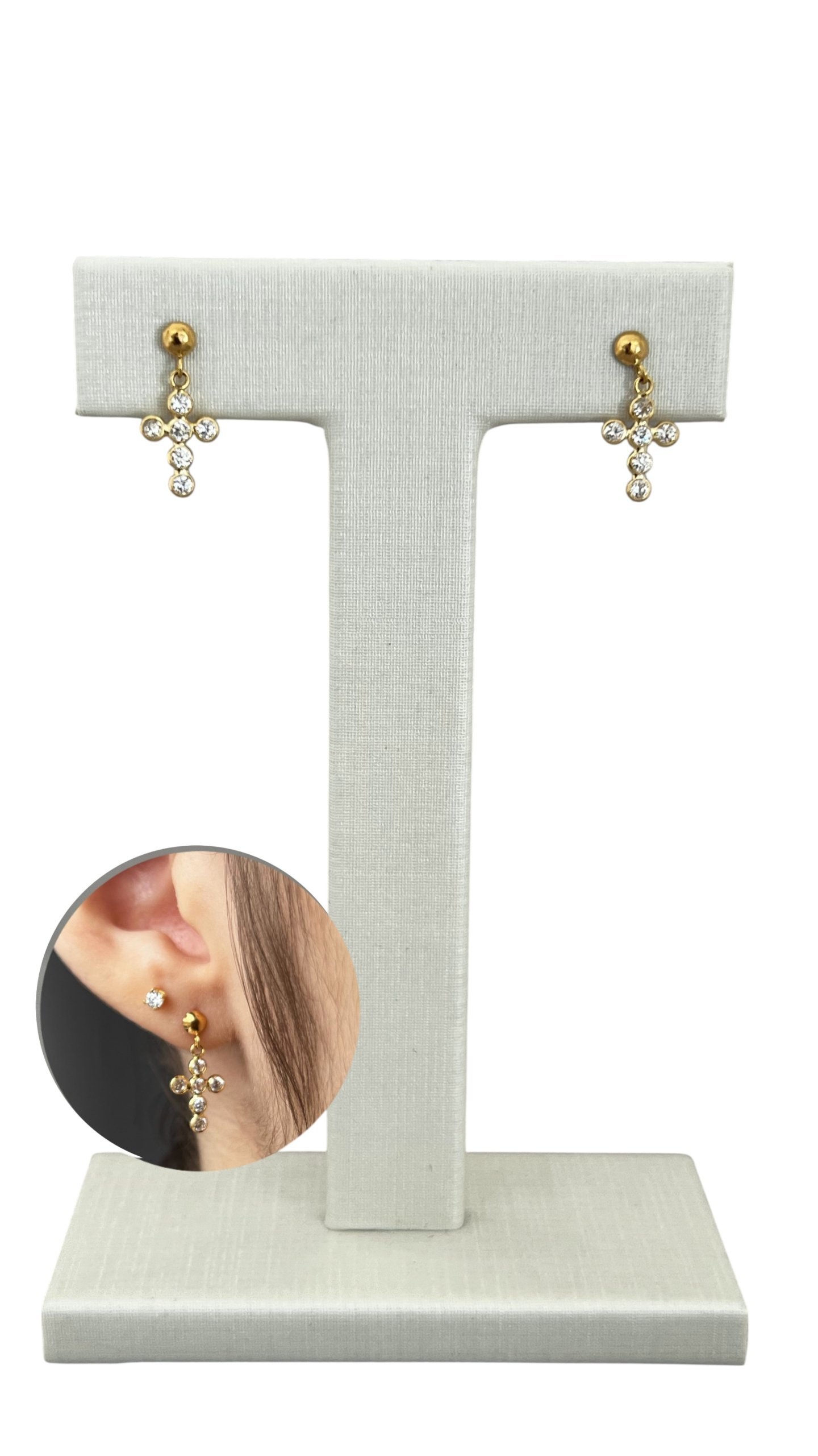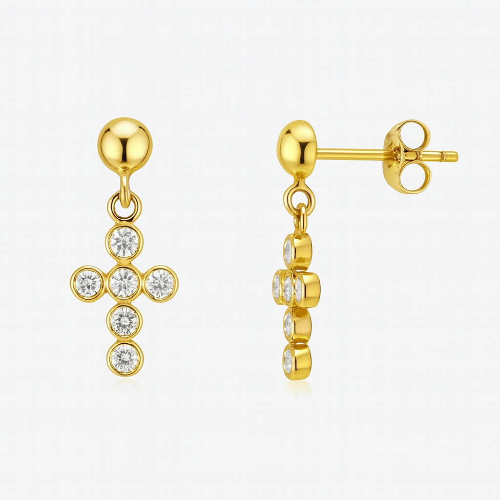 Brinco cruz em ouro 18k com zircônias.