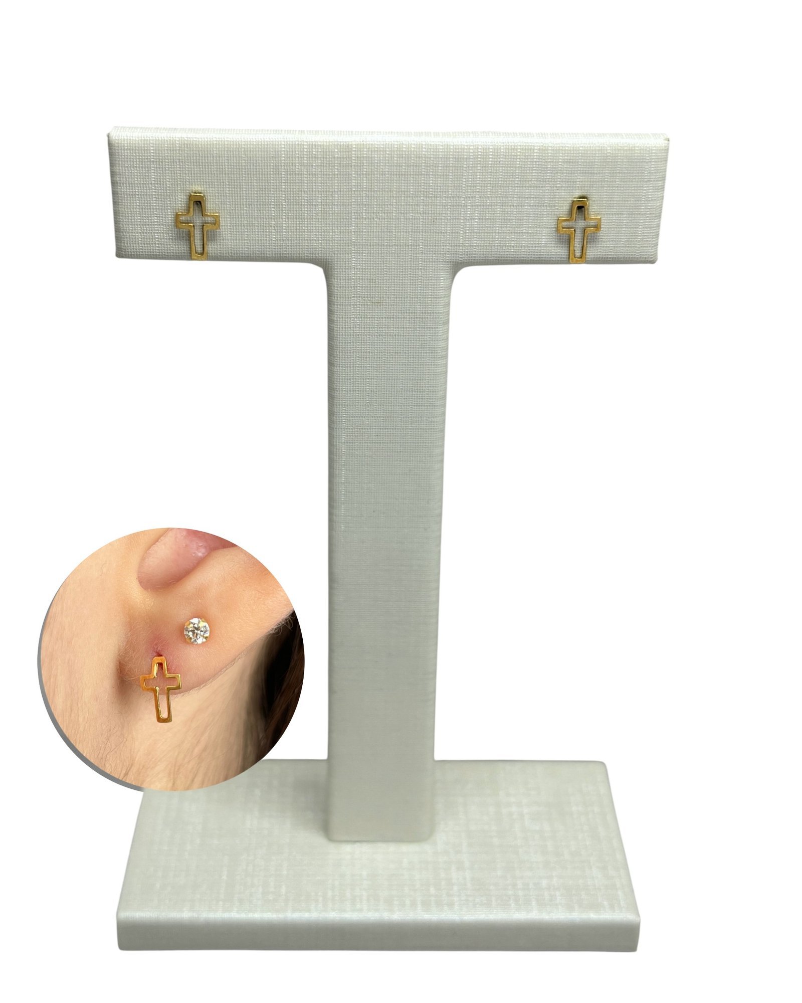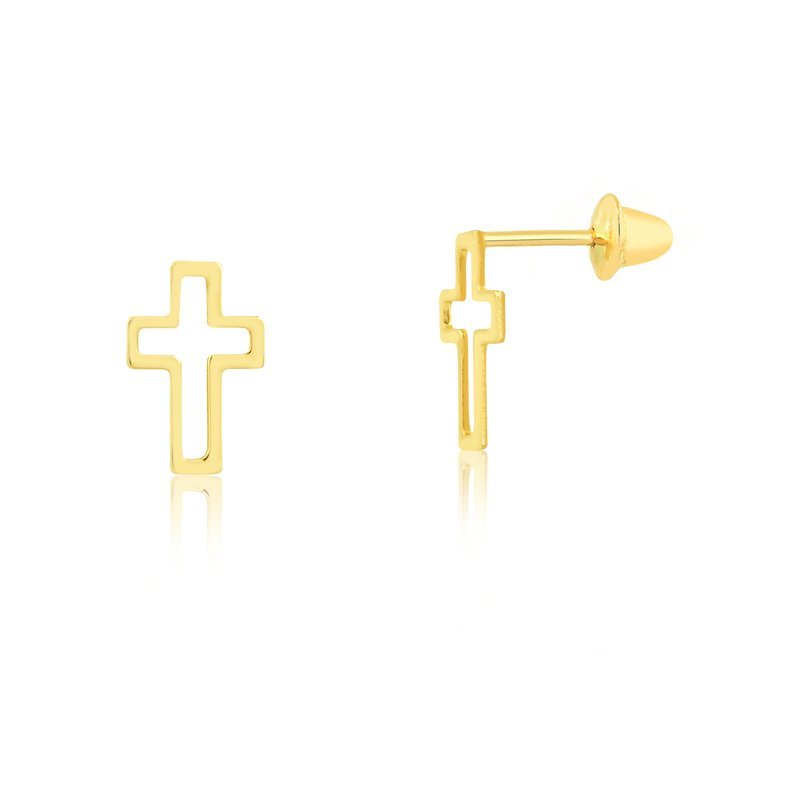 Brinco cruz vazada P em ouro 18k.