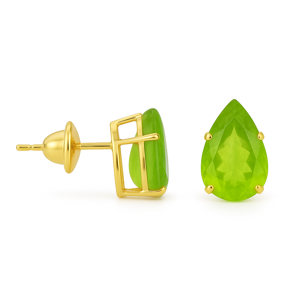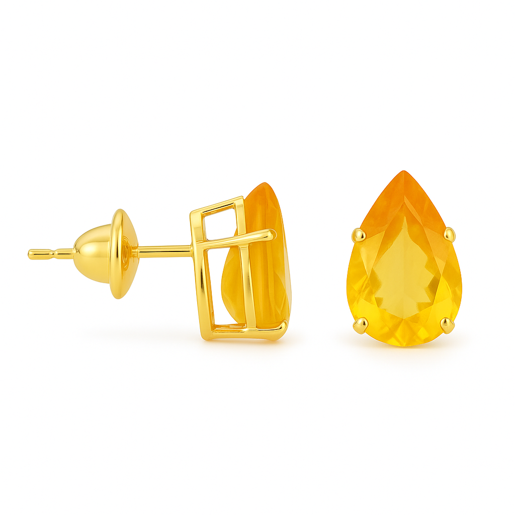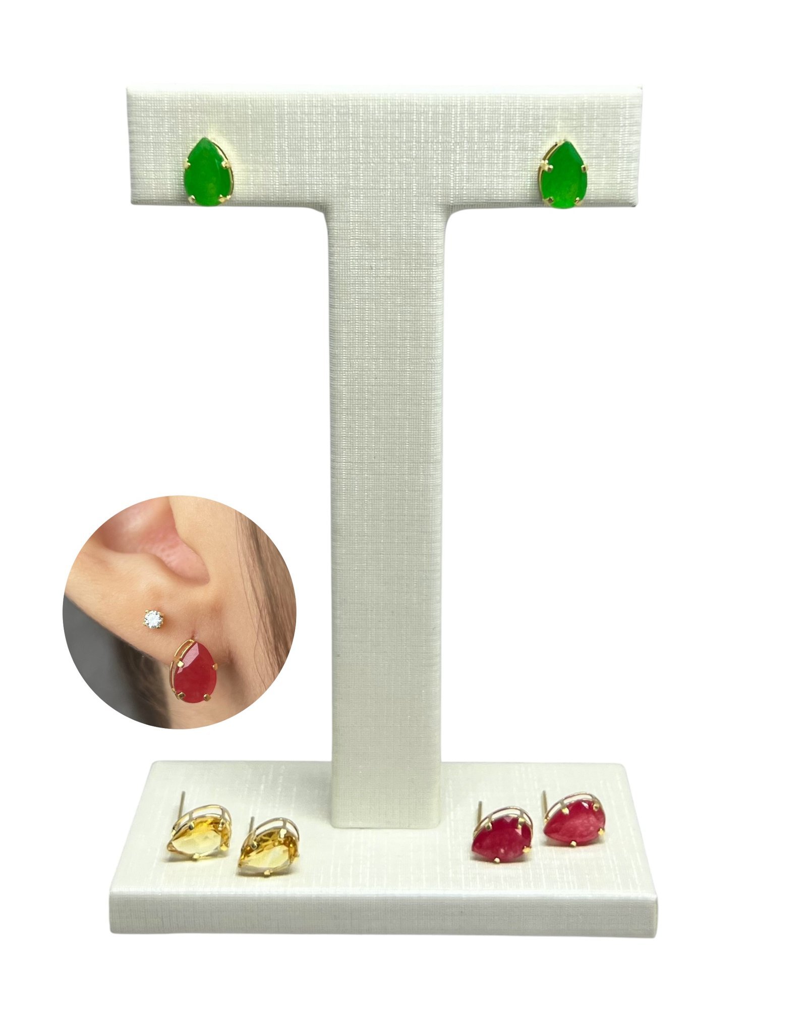 Brinco gota em ouro 18k com pedra natural citrino, jade vermelha e jade verde, medindo 6x9mm.