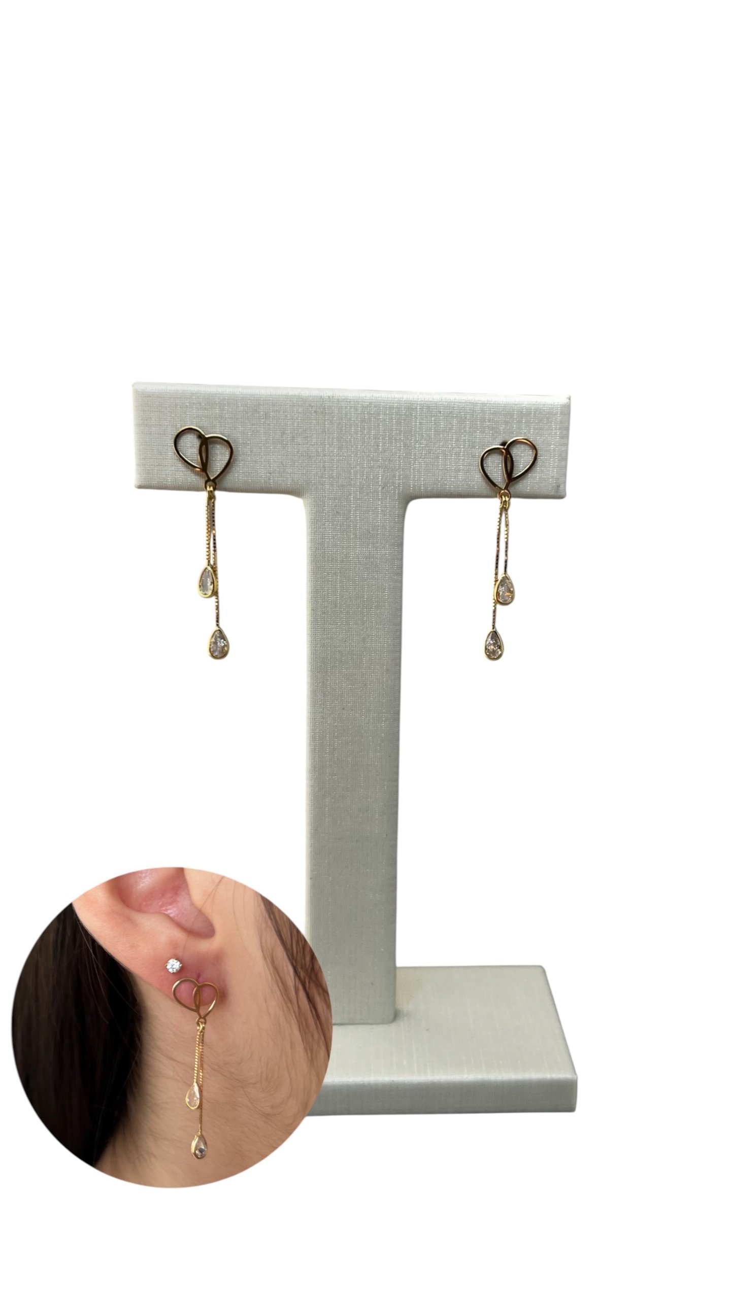 Brinco gota dupla vazada e venezianas em ouro 18k com zircônias.