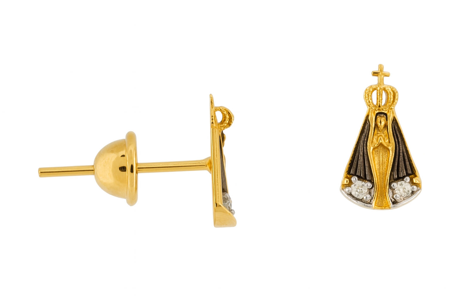 Brinco Nossa Senhora Aparecida em ouro 18k com zircônias.