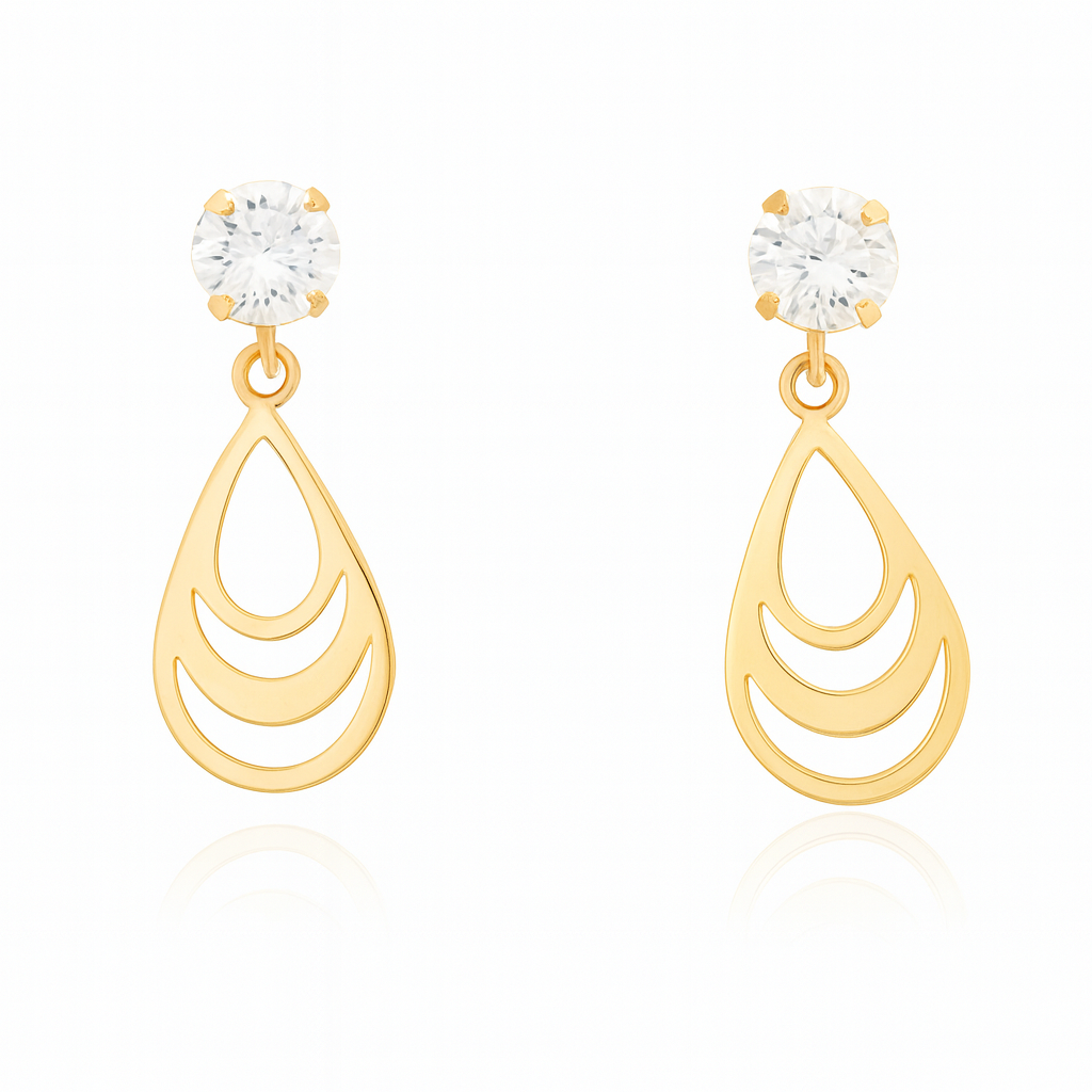 Brinco gota vazada em ouro 18k com zircônia.