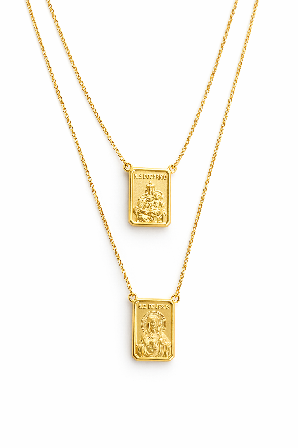 Escapulário corrente cartier de 60cm em ouro 18k com medalhas duplas quadradas.