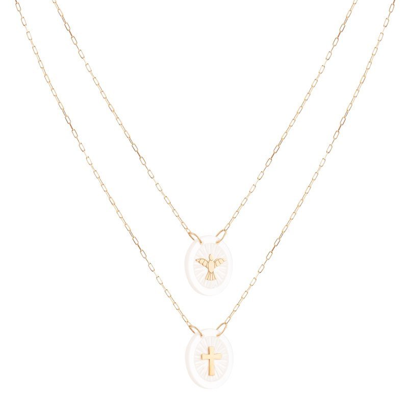 Escapulário corrente cartier de 60cm com medalhas em madrepérola e cruz e Espírito Santo em ouro 18k.