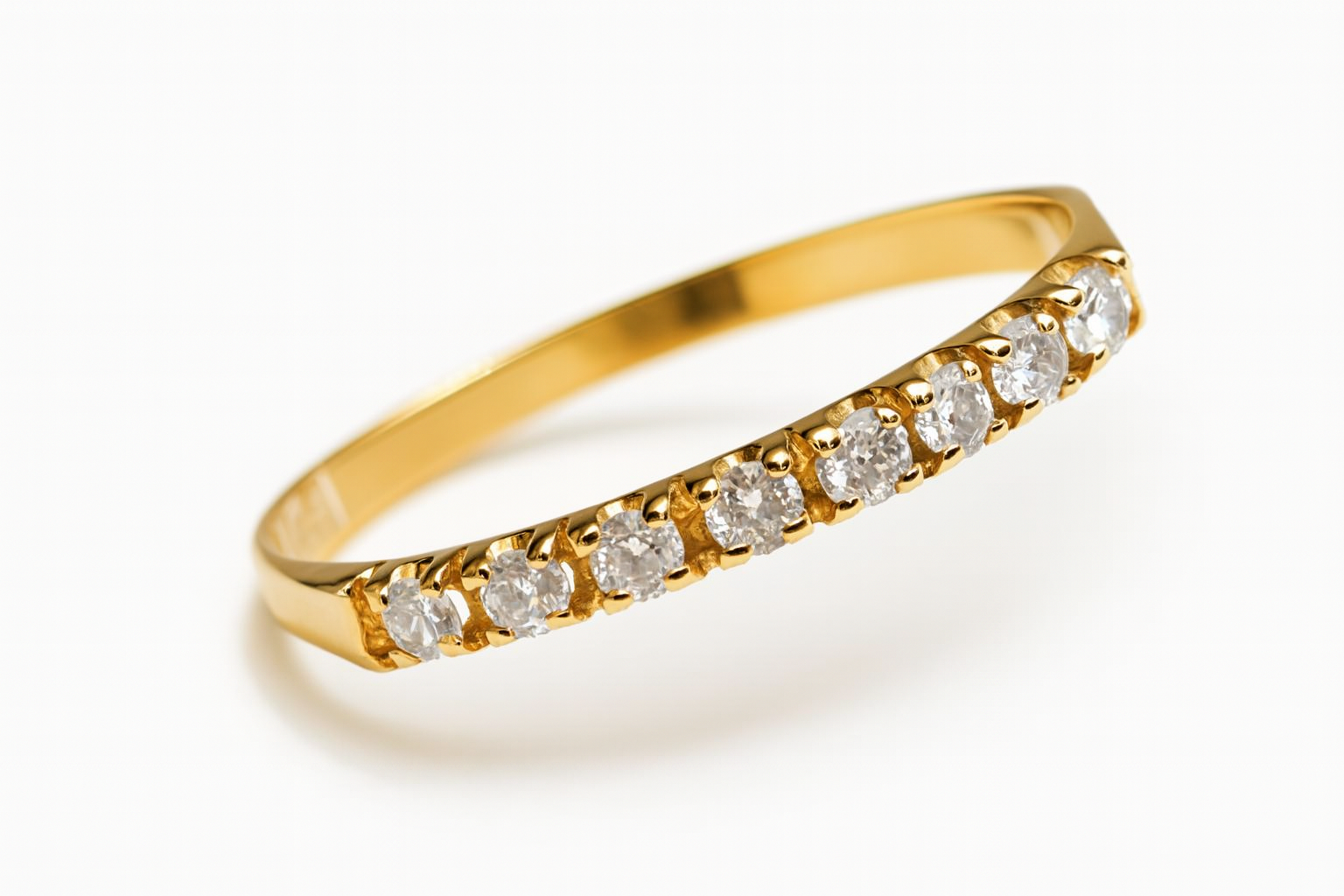 Meia aliança em ouro 18k com 8 brilhantes de 3 pts.