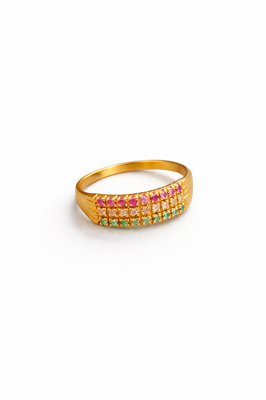 Meia aliança tripla em ouro 18k com pedras naturais (Rubi, Esmeralda e Brilhante).
