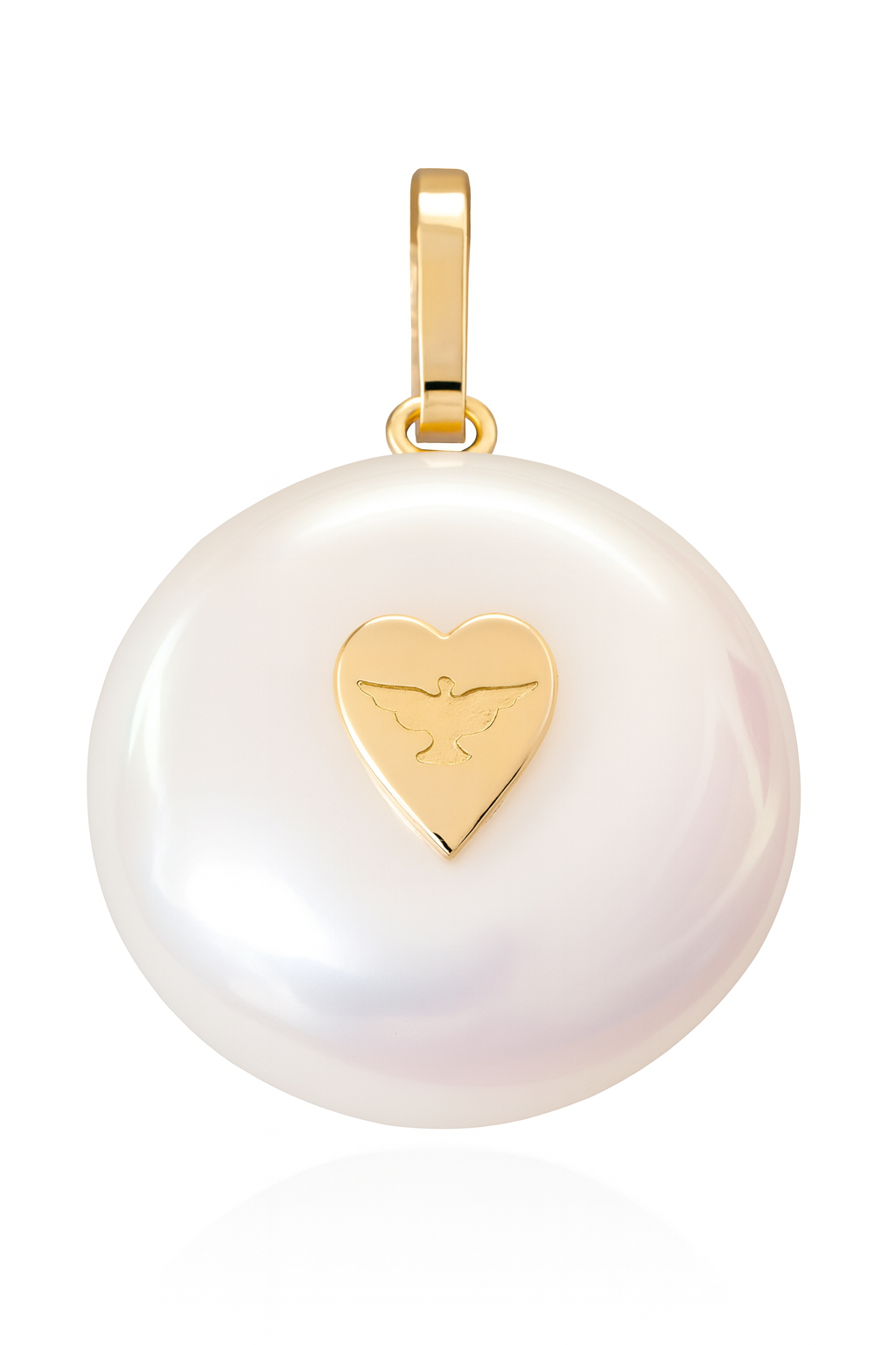 Pingente bola em madrepérola medindo 16mm de diâmetro com coração e Espírito Santo em ouro 18k.