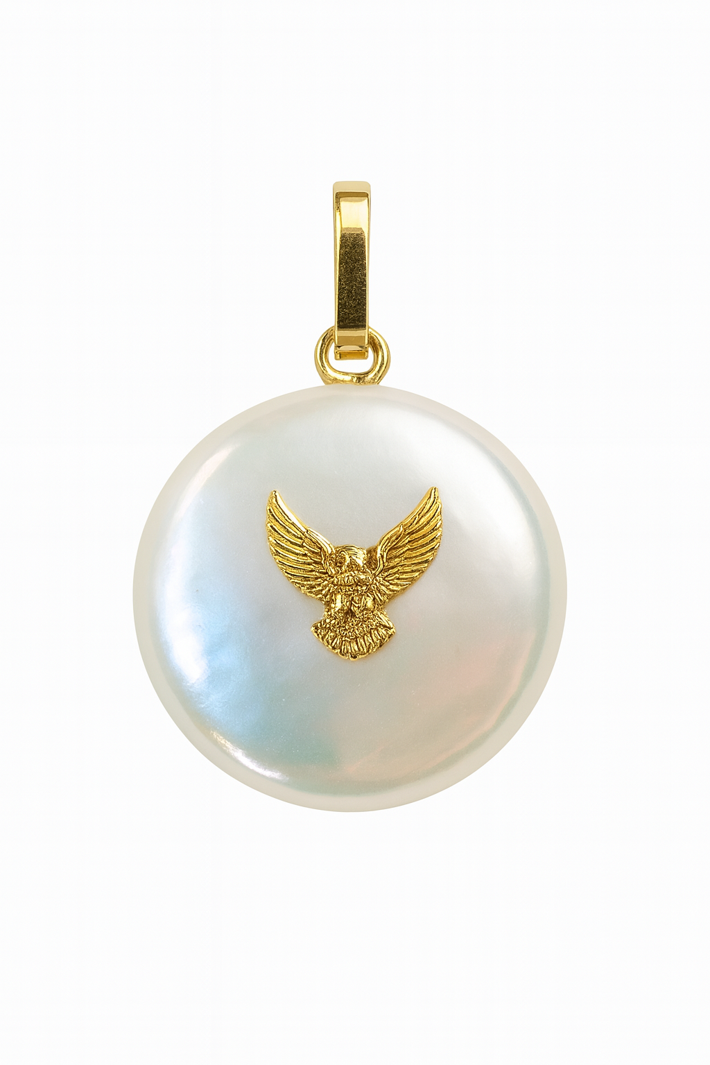 Pingente bola em madrepérola medindo 14mm de diâmetro com Espírito Santo em ouro 18k.