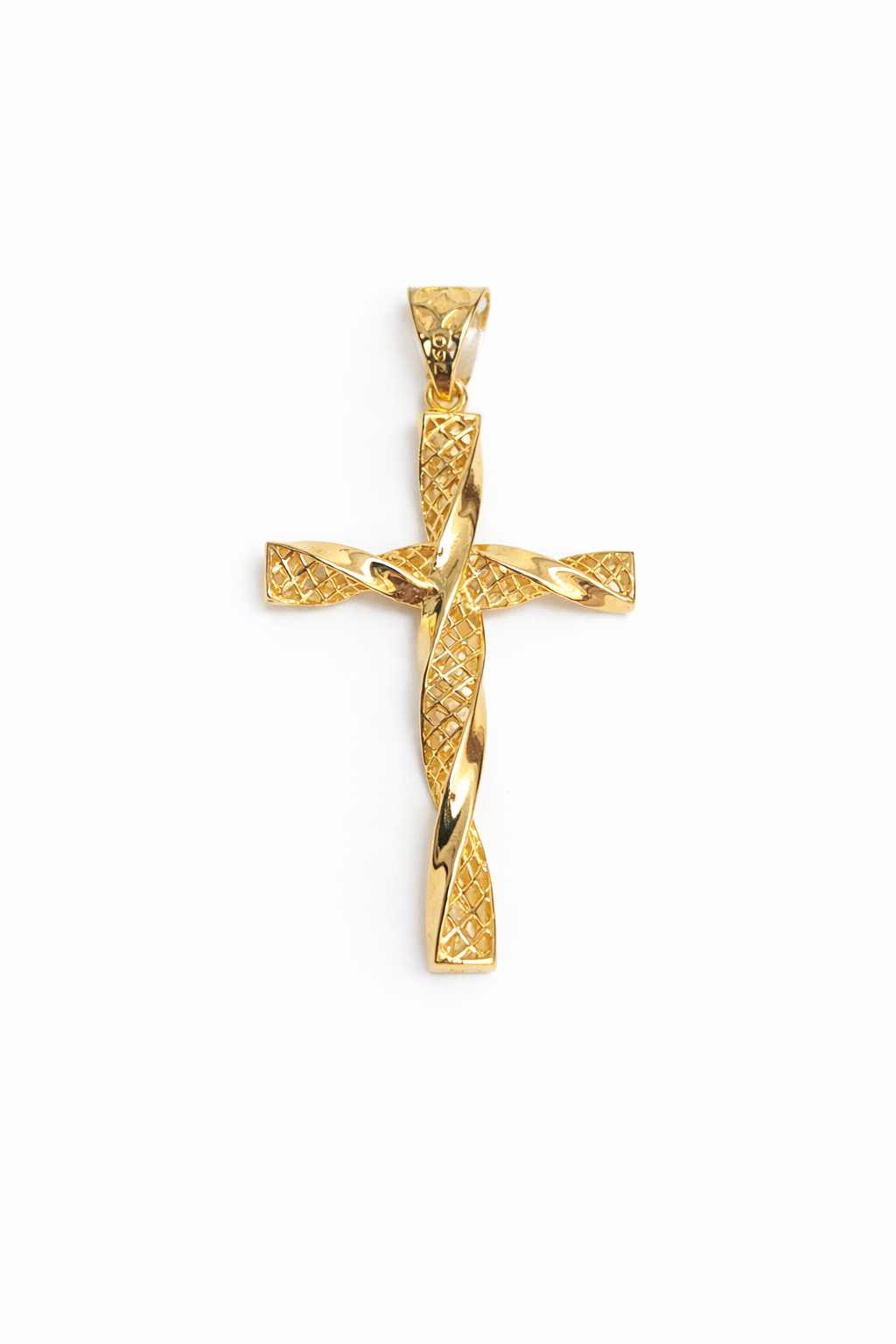 Pingente cruz diamantada torcida em ouro 18k.