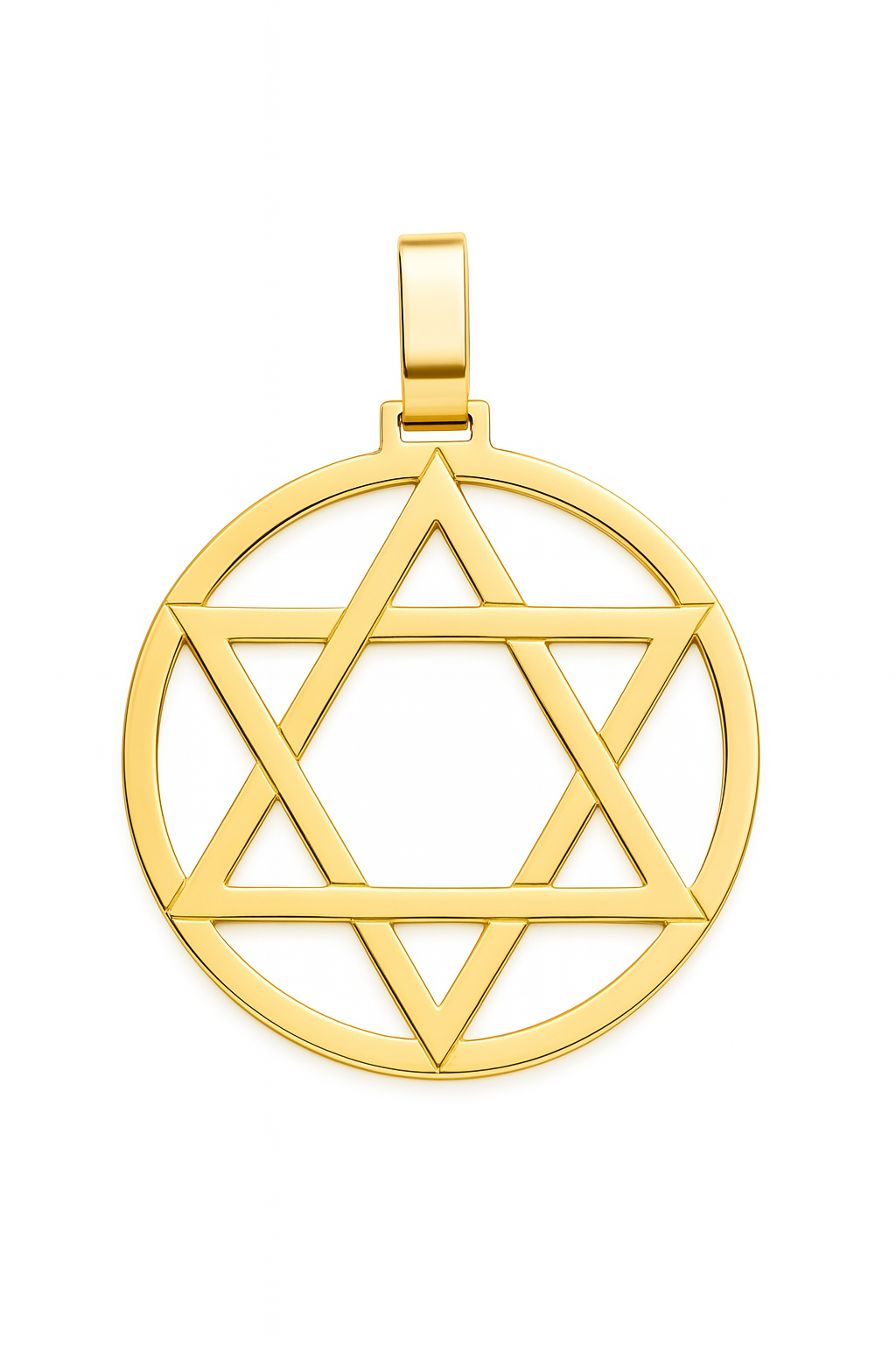 Pingente estrela de Davi G vazado medindo 26mm de diâmetro em ouro 18k.