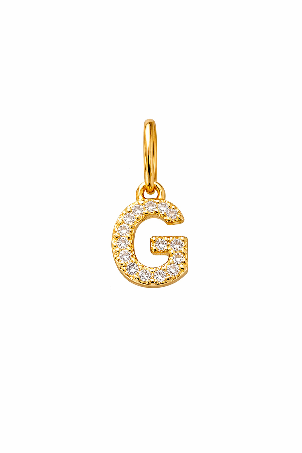 Pingente letra G de 5,5mm em ouro 18k com zircônias.