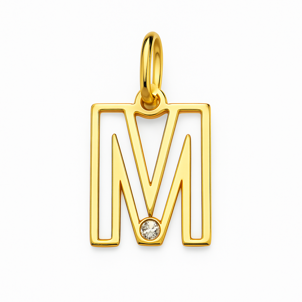 Pingente letra M vazada em ouro 18k com 1 brilhante.
