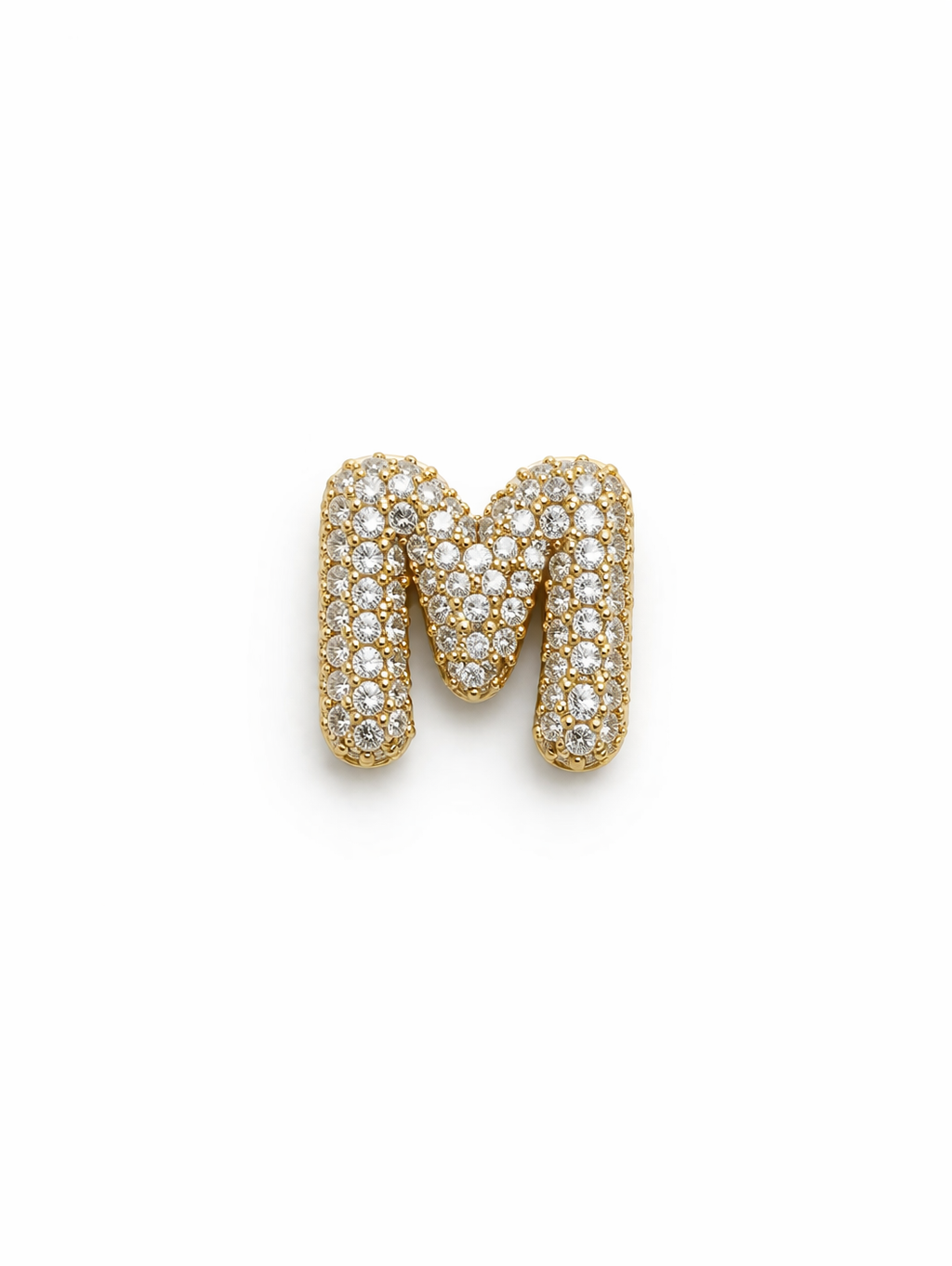 Pingente letra M galeria em ouro 18k cravejado em zircônias.