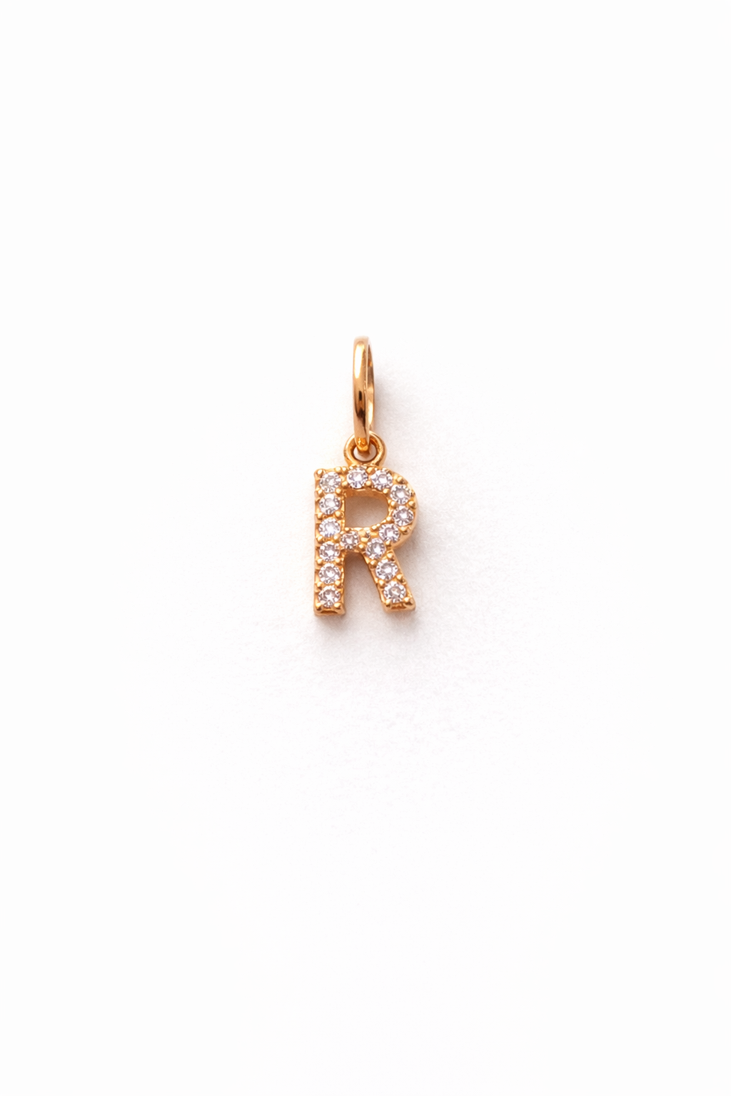 Pingente letra R de 5,5mm em ouro 18k com zircônias.