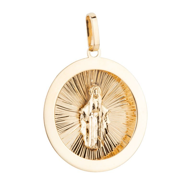 Pingente Nossa Senhora das Graças redondo com fios em ouro 18k.