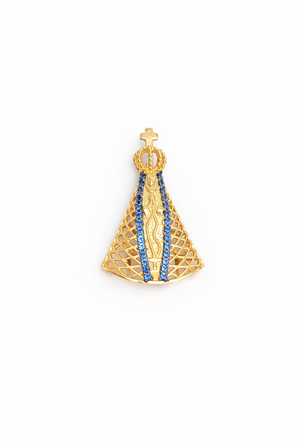 Pingente Nossa Senhora Aparecida fios em ouro 18k com zircônias.