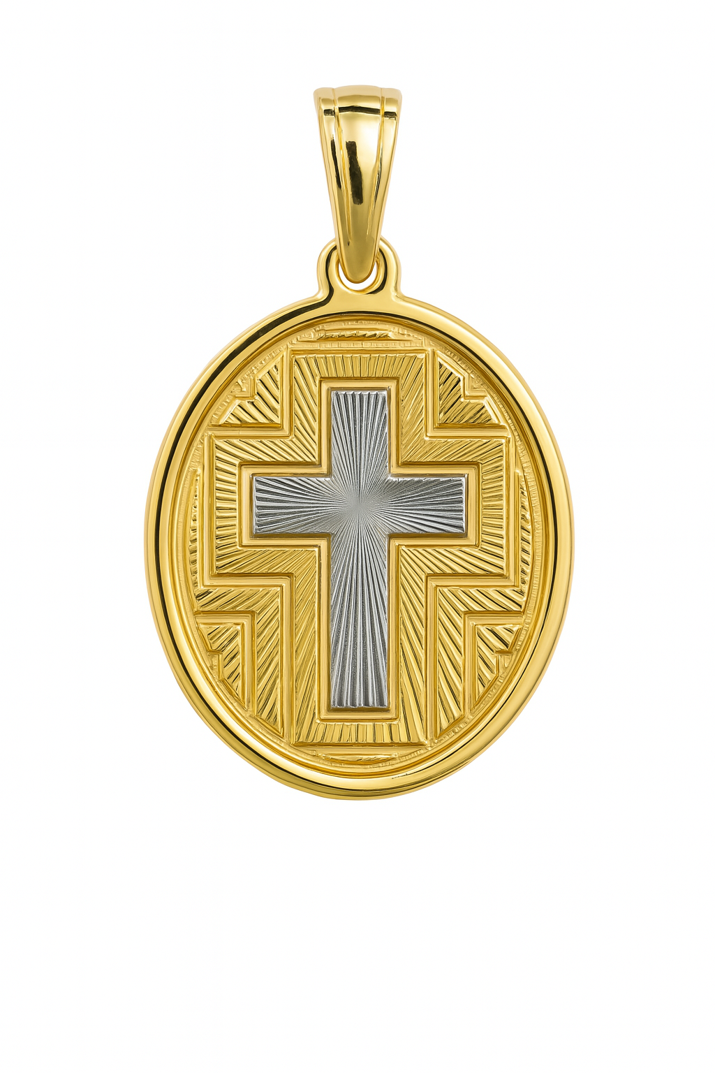 Pingente placa oval com cruz em ouro 18k e ouro branco.