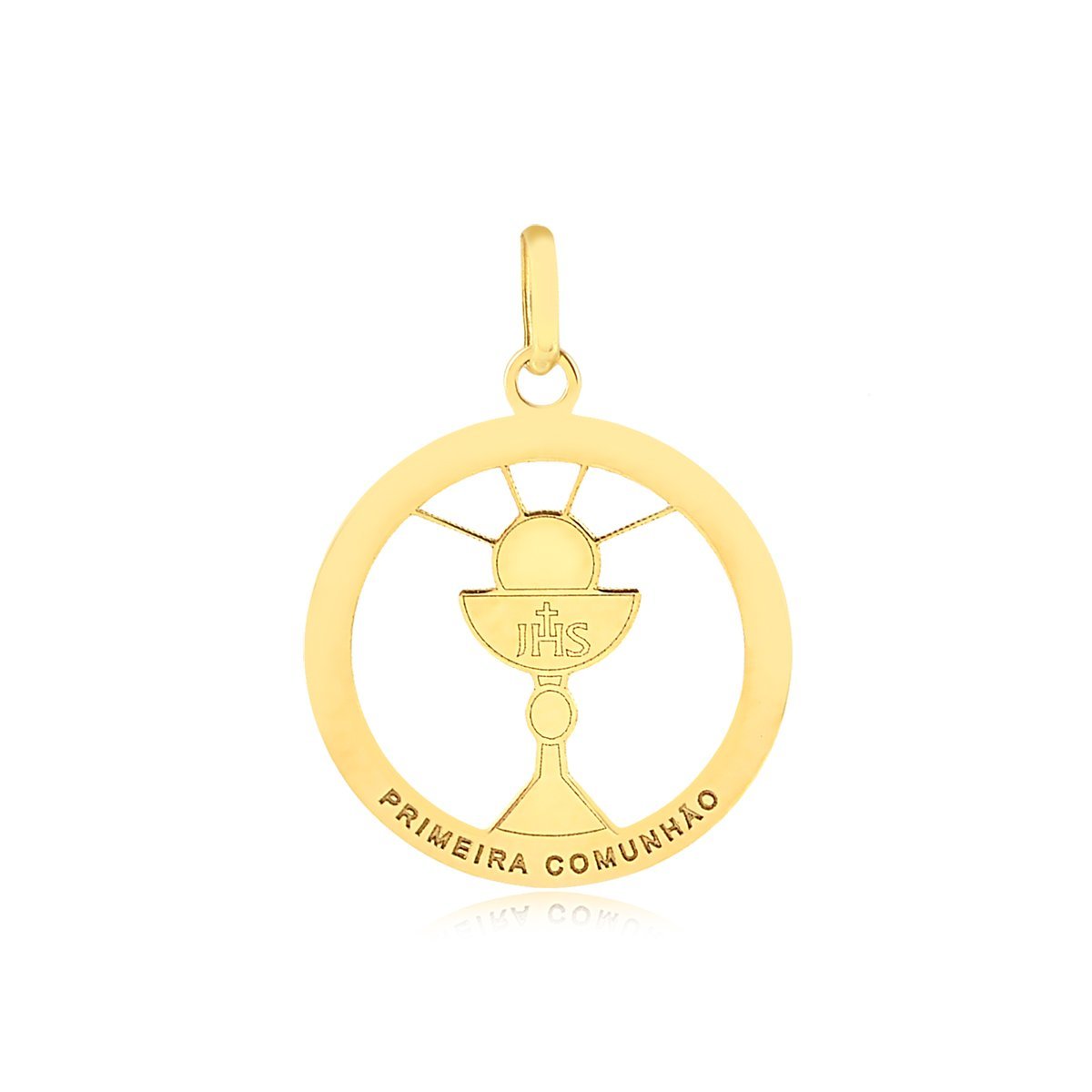 Pingente primeira comunhão medindo 15mm de diâmetro em ouro 18k.
